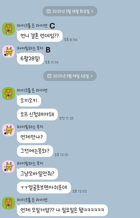 위에 상황이 한 달전 이야기인데 약속을 일주일도 안남겨 놓은 상황에서 단톡방에서는 그래서 우리 어디서 볼까? 만나면 너무 재밌겠다. 오랜만에 만나서 회포 풀자라는 이야기가 있었지만 정작 당사자인 B는 대답이 없었어.