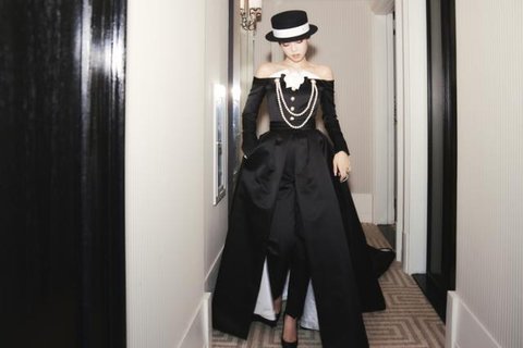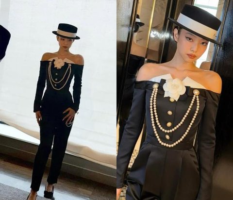 그는 자신이 앰버서더로 활동 중인 프랑스 명품 브랜드 C사의 블랙 정장 팬츠에 오프숄더 블랙 새틴 점프수트를 매치해 유니크하고 중성적인 매력을 드러냈다. 이와 함께 투톤 중절모와 C사의 시그니처로 꼽히는 화이트 플라워 브로치, 진주 장식을 더해 클래식한 무드를 강조했다.