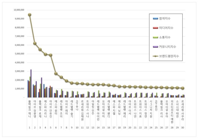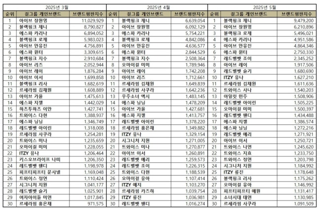 2025년 5월 걸그룹 개인 브랜드평판 30위 순위는 블랙핑크 제니, 아이브 장원영, 블랙핑크 로제, 에스파 카리나, 아이브 안유진, 에스파 윈터, 레드벨벳 조이, 아이브 레이, 레드벨벳 슬기, ITZY 유나, 르세라핌 김채원, 트와이스 사나, 아일릿 민주, 레드벨벳 아이린, 오마이걸 미미, 레드벨벳 웬디, 에스파 지젤, 에스파 닝닝, 레드벨벳 예리, 아이브 이서, 트와이스 나연, 트와이스 지효, 트와이스 정연, 시그니처 지원, ITZY 류진, 블랙핑크 리사, 오마이걸 유아, 피프티피프티 예원, 소녀시대 태연, 르세라핌 사쿠라 순으로 분석됐다.