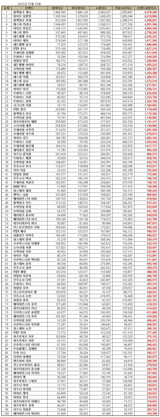 1위 제니, 2위 장원영, 3위 로제2025년 5월 걸그룹 개인 브랜드평판 100위 브랜드는 블랙핑크 제니, 아이브 장원영, 블랙핑크 로제, 에스파 카리나, 아이브 안유진, 에스파 윈터, 레드벨벳 조이, 아이브 레이, 레드벨벳 슬기, ITZY 유나, 르세라핌 김채원, 트와이스 사나, 아일릿 민주, 레드벨벳 아이린, 오마이걸 미미, 레드벨벳 웬디, 에스파 지젤, 에스파 닝닝, 레드벨벳 예리, 아이브 이서, 트와이스 나연, 트와이스 지효, 트와이스 정연, 시그니처 지원, ITZY 류진, 블랙핑크 리사, 오마이걸 유아, 피프티피프티 예원, 소녀시대 태연, 르세라핌 사쿠라, 르세라핌 카즈하, 아이브 리즈, 트와이스 다현, 르세라핌 홍은채, 에이핑크 정은지, 이즈나 윤지윤, 트와이스 채영, 오마이걸 아린, 우주소녀 보나, 키키 지유, 아일릿 원희, 우주소녀 엑시, 르세라핌 허윤진, EXID 하니, 걸스데이 혜리, 엔믹스 설윤, 베이비몬스터 아현, 블랙핑크 지수, 오마이걸 효정, 오마이걸 승희, 에이핑크 윤보미, 베이비몬스터 아사, 피프티피프티 하나, 키스오브라이프 나띠 , ITZY 예지, 러블리즈 이미주, 걸스데이 민아, 프로미스나인 이채영, 소녀시대 서현, 오마이걸 지호, 아이브 가을, 프로미스나인 백지헌, 걸스데이 유라, 우주소녀 설아, ITZY 채령, 아일릿 이로하, 우주소녀 다영, 트와이스 미나, 아일릿 모카, 키스오브라이프 벨 , 우주소녀 수빈, 아일릿 윤아, 베이비몬스터 루카, 피프티피프티 키나, 프로미스나인 송하영, 베이비몬스터 로라, 오마이걸 유빈, 프로미스나인 박지원, 걸스데이 소진, ITZY 리아, 하츠투하츠 지우, 하츠투하츠 이안, 프로미스나인 이나경, 트리플에스 김채연, 우아 나나, 다이아 정채연, 캣츠아이 라라, 키스오브라이프 쥴리 , 피프티피프티 문샤넬, 베이비몬스터 치키타, 하이키 옐, 하츠투하츠 스텔라, 이즈나 마이, 이즈나 방지민, 미야오 엘라, 미야오 안나, 피프티피프티 아테나, 하츠투하츠 유하, 이즈나 최정은, 베이비몬스터 파리타 순으로 분석됐다.