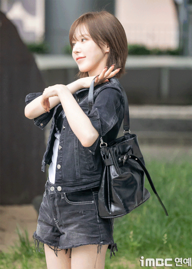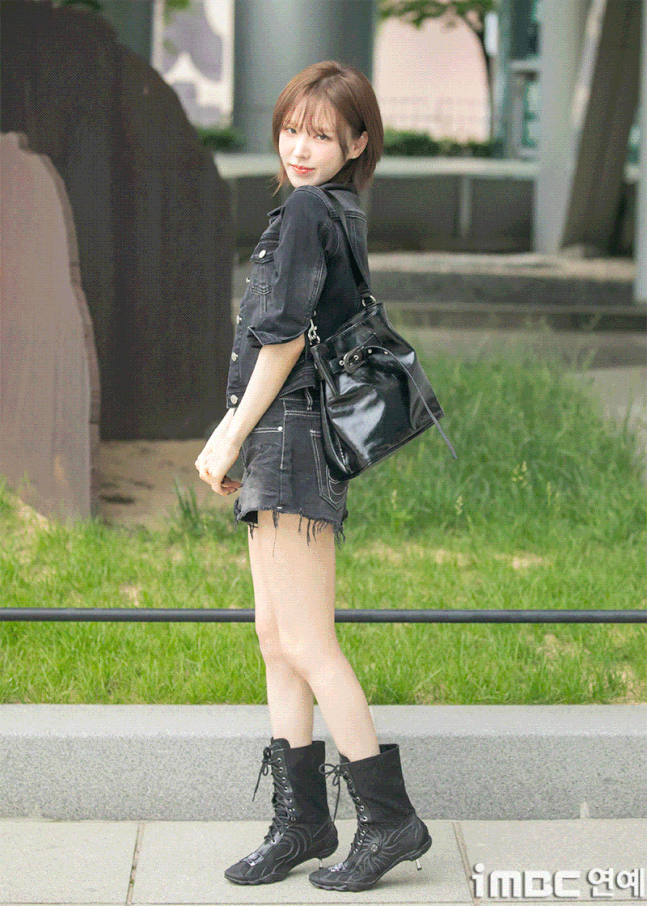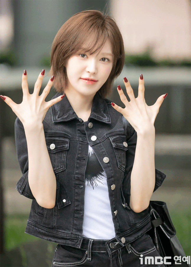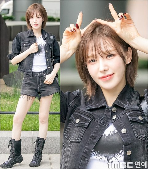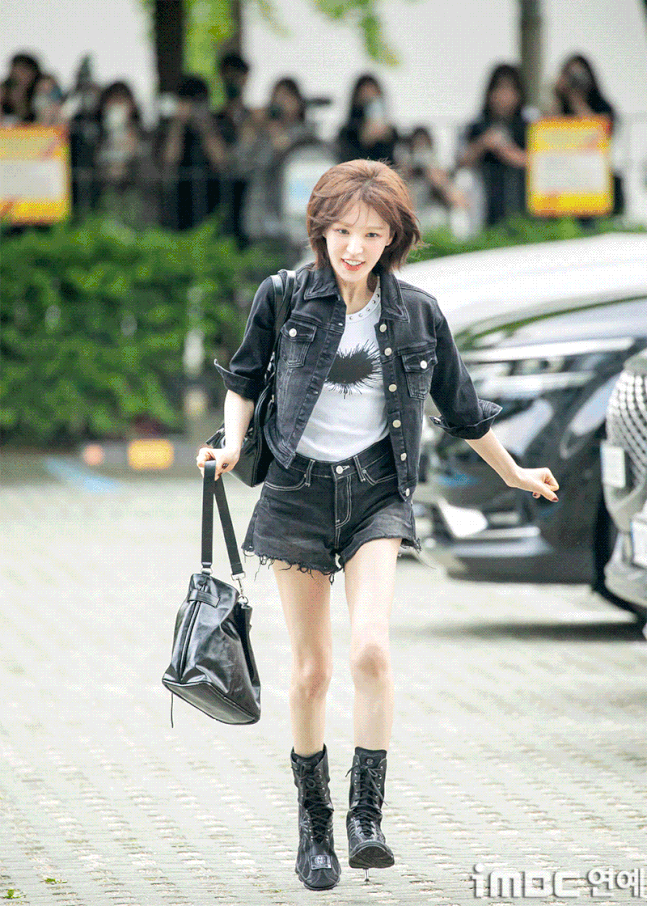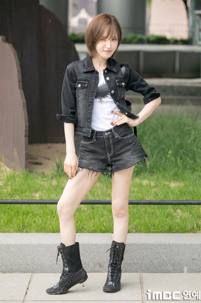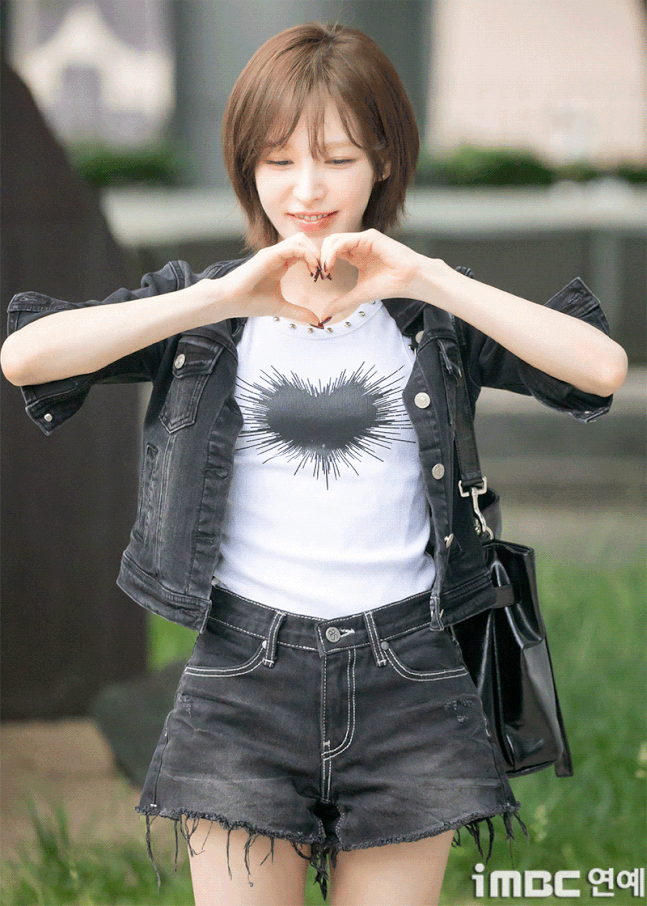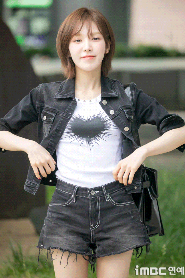 레드벨벳(Red Velvet) 웬디가 20일 오후 서울 목동SBS에서 열린 '웬디의 영스트리트' 출근길에 포즈를 취하고 있다.이날 웬디는 브라운 염색 단발 허쉬컷 스타일에 검정 재킷과 숏팬츠. 하트가 포인트인 화이트 이너 티에 워커를 매치. 락스타 느낌의 패션을 뽐냈다. 습하고 더운 날씨에도 불구, 웬디는 수많은 팬들에게 화답하며 여전히 힘차게 뛰며 출근했다.