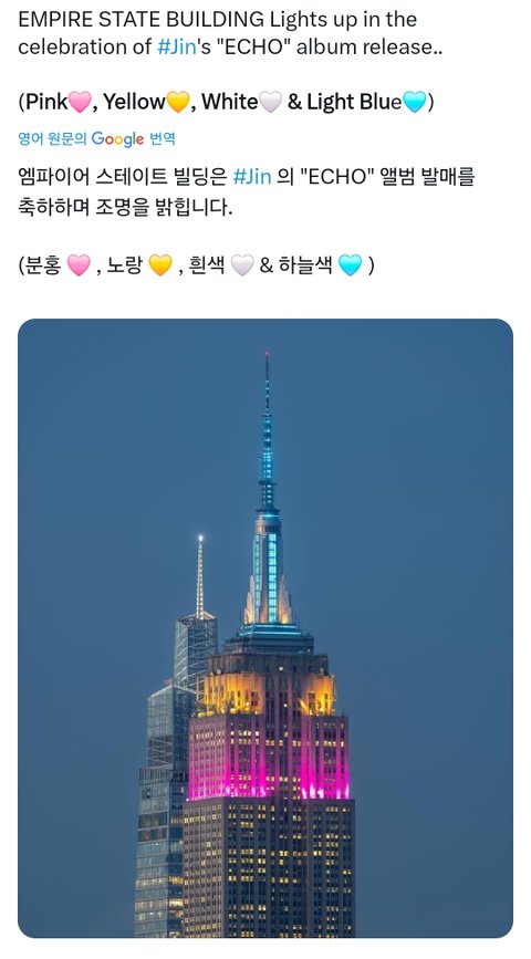 추반짤 진 2집 앨범 기념 뉴욕 엠파이어스테이트 빌딩 조명 밝힌 kpop 솔로 최초 가수(22년에도 디애넛 기념 조명 밝혀줌