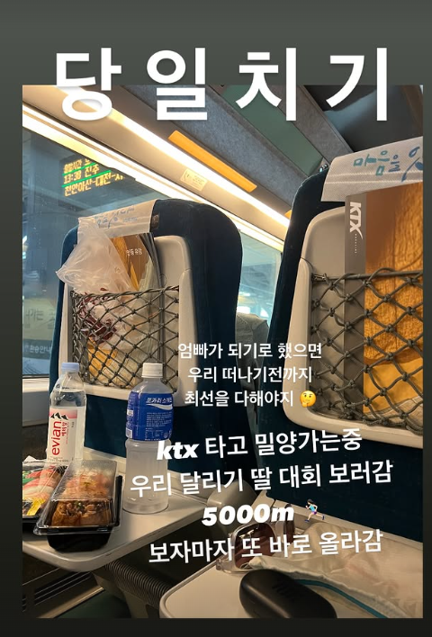 진태현 SNS 캡처.사진에는 진태현, 박시은 부부가 최근 입양한 딸의 마라톤 경기를 보기 위해 밀양으로 향하는 모습이 담겼다. 그는 “KTX 타고 밀양 가는 중. 우리 딸 달리기 대회 보러간다. 5,000m”라며 “보자마자 또 바로 올라감”이라고 말했다.