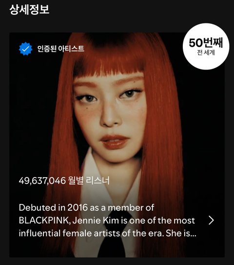 + 현재 스포티 리스너 4963만으로 전세계 50위&k팝 1위 (피크는 5천만 넘음)