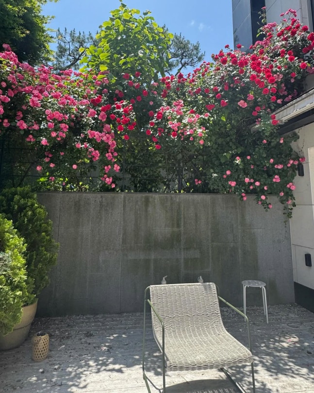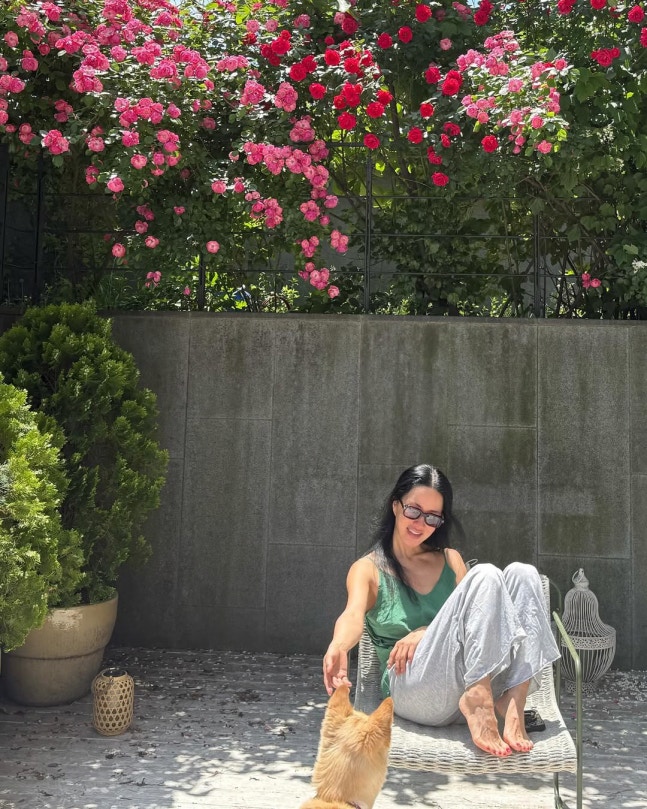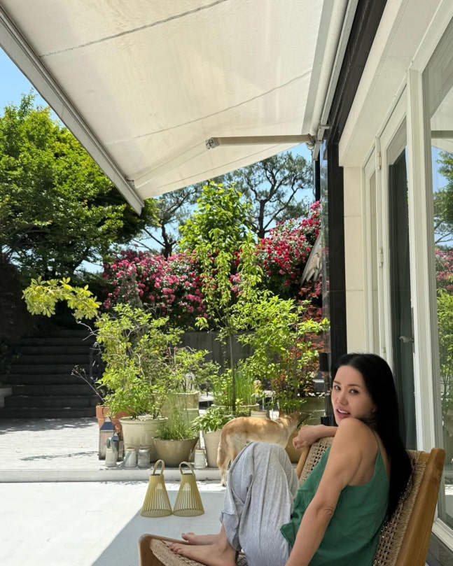 사진 속에는 쉬는 날을 맞아 장미가 예쁘게 핀 집 마당에서 여유 가득한 시간을 보내고 있는 엄정화의 모습이 담겨있다.