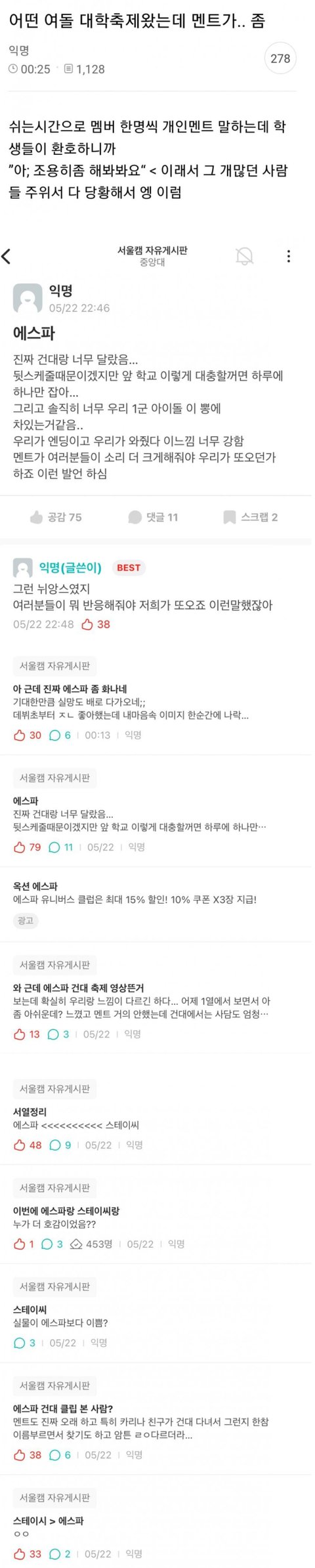 https://youtu.be/HzaAGOZzwOU?si=JS4iAM-ZyOeNLf6a 영상 링크 첨부해줄테니 직접 보고나 얘기해 날씨가 너무 더운데도 여러분 환호성이 너무 좋아서 무대 잘할 수 있었다 다음 곡이 여러분들이 가장 잘아실만한 곡이다 중앙대 학생 분들의 목소리가 얼마나 큰지 궁금하다 환호가 커야 내년에 저희가 또 올 수 있지 않을까 진짜 어떤 아이돌 축제 영상에서나 볼 수 있는 흔한 호응 유도 멘트 가지고 연예인 병 ㅇㅈㄹ 하는건 걍 에스파가 ㅈㄴ 싫은거겠지ㅋㅋㅋㅋㅋㅋ