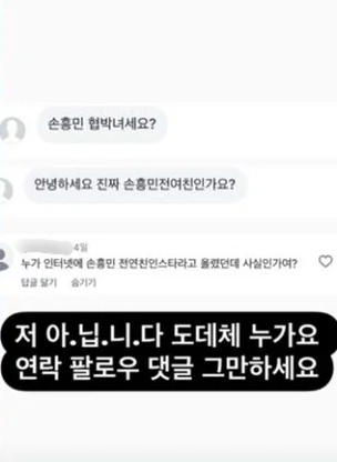 공개된 사진에는 “손흥민 협박녀세요?”, “안녕하세요 진짜 손흥민 전여친인가요?”, “누가 인터넷에 손흥민 전여친 인스타라고 올려던데 사실인가요?” 라는 메시지와 댓글이 달려있는 모습이다.