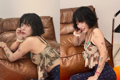 사진에는 쇼파에 기대 카메라를 바라보는 지민의 모습이 담겼다. 짧은 웨이브 머리에 민소매 상의, 패턴 팬츠를 매치한 스타일링으로 눈길을 끈다. 특히 양팔을 가득 채운 타투가 시선을 사로잡는다.