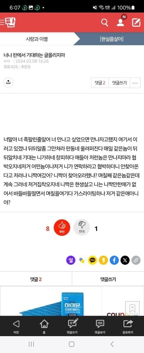 처박힌 애를 8년을 쫓아다니냐? 힘들어죽겠다고.