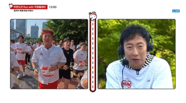 박명수가 해설을 맡은 반면 정준하는 직접 달리고 있어 눈길을 모았다. 박명수는 “정준하는 완주하지 못할 거 같다. 몸이 무겁다. 10km 뛰기에는 부담될 거다. 윤시윤이 옆에서 페이스 메이커로 같이 뛰어주고 있으니 도움이 되겠지만 나이가 있으니 어느 정도 하다가 나오라고 했다”고 말했다.