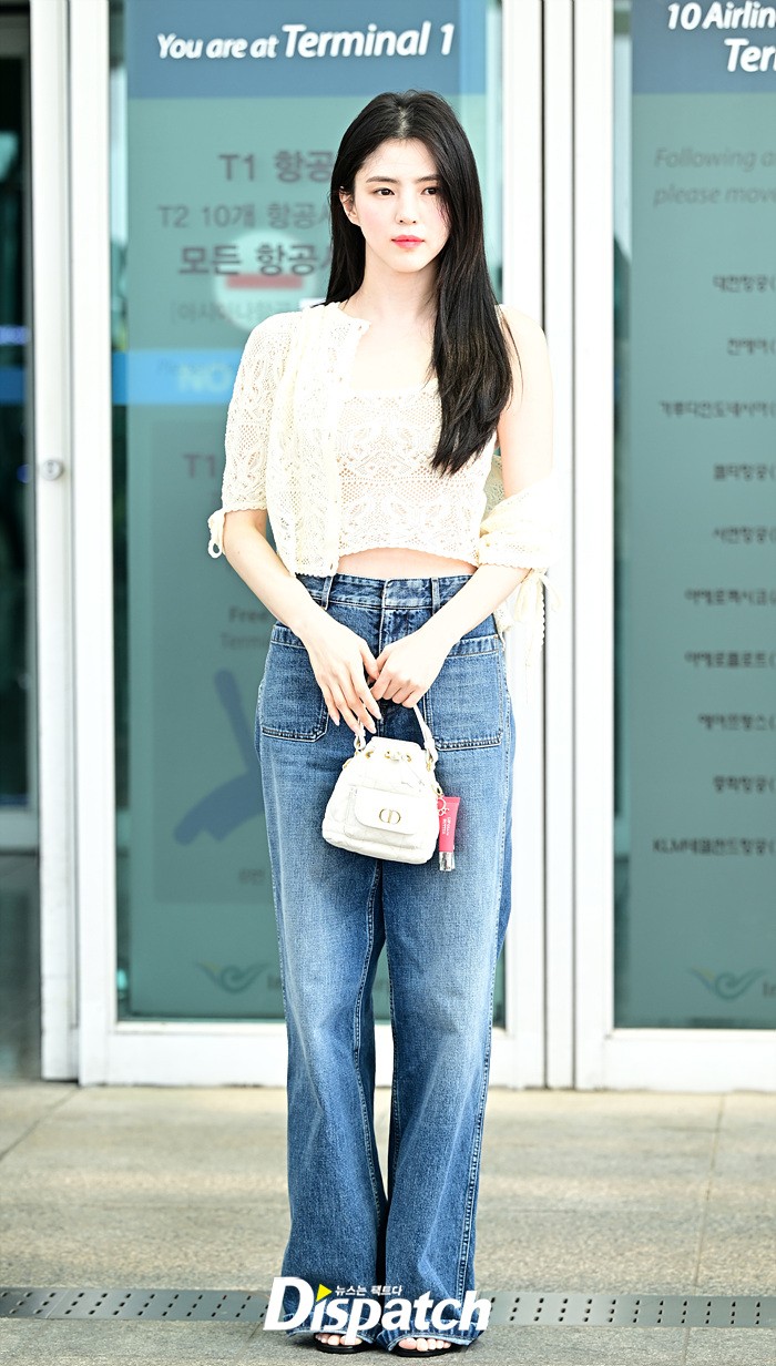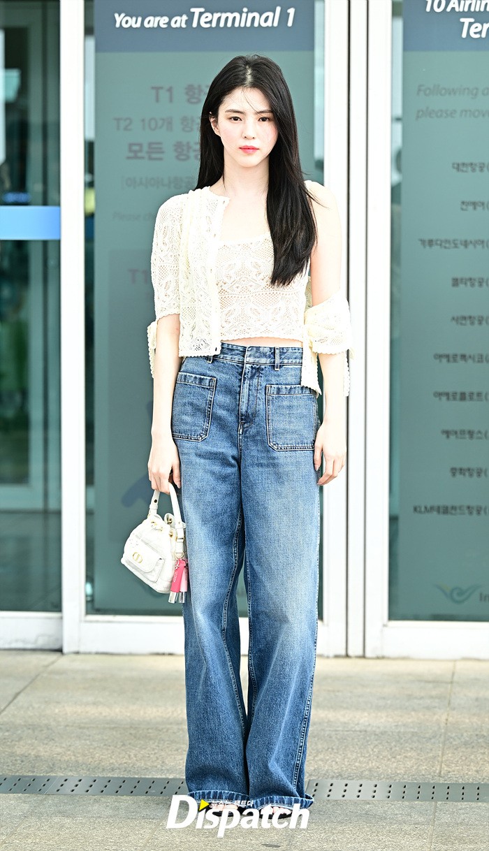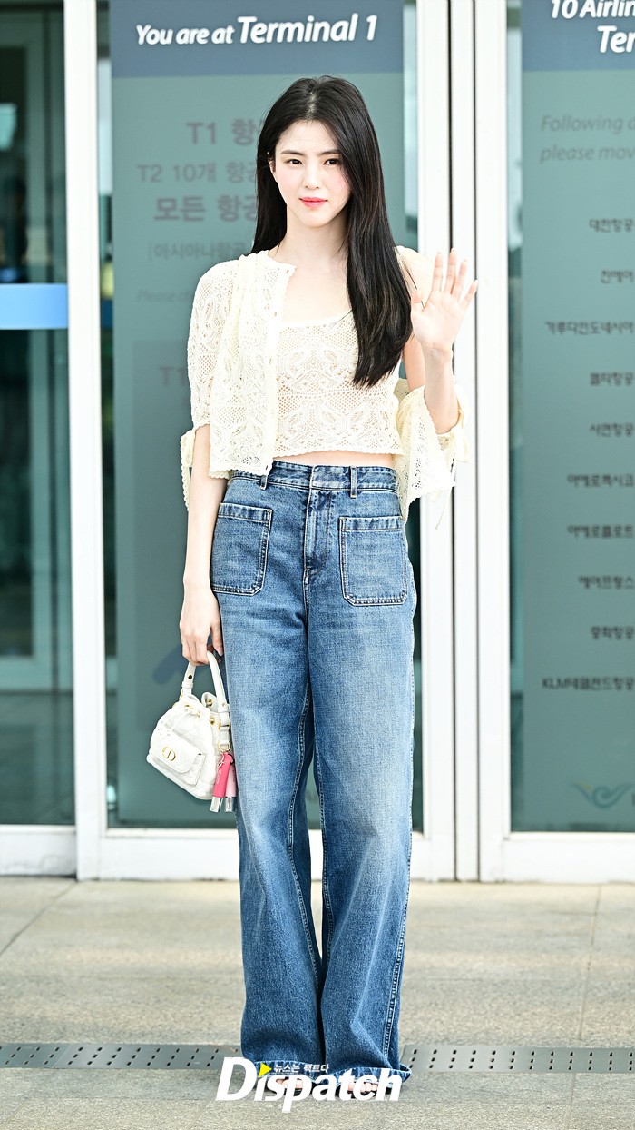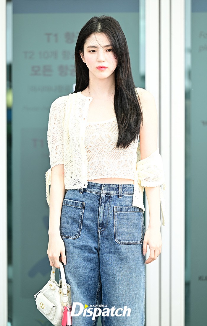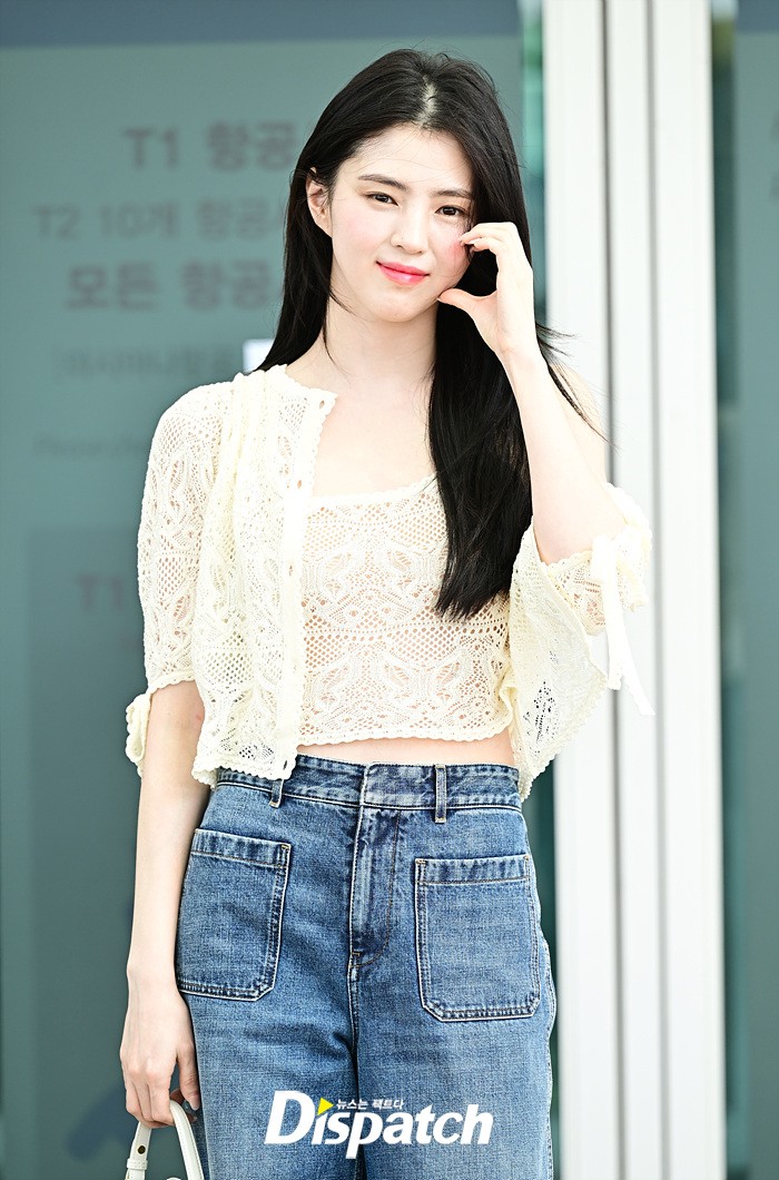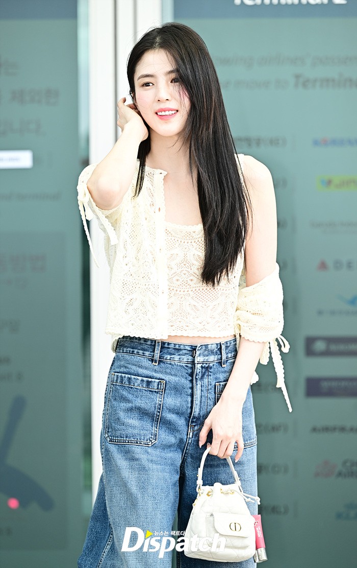 한소희는 화이트 블라우스와 데님진으로 캐주얼한 공항패션을 연출했다. 인형같은 비주얼과 러블리한 미소가 돋보였다.