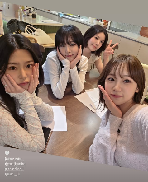 22일 아이즈원 출신 배우 김민주는 자신의 소셜미디어(SNS)에 사진을 게재했다. 사진 속에는 전 아이즈원 멤버였던 권은비, 김민주, 김채원, 최예나가 함께 밝은 표정으로 카메라를 바라보는 모습이 담겨 반가움을 안겼다.