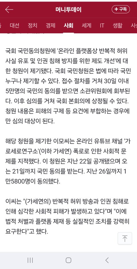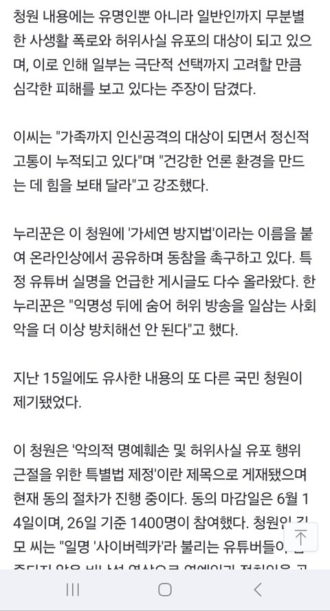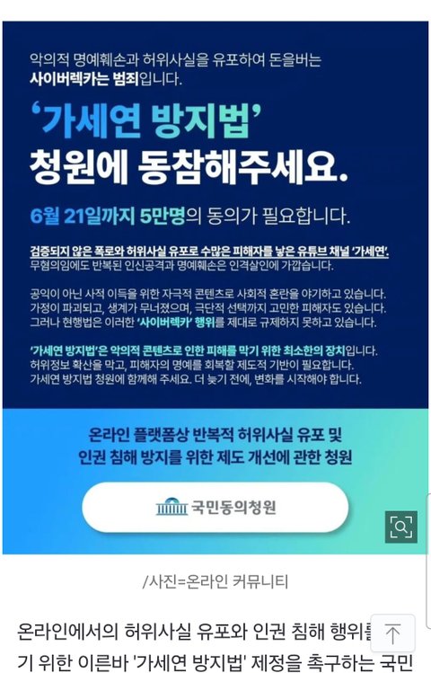 청원의 정확한 목적은"온라인 플랫폼상 반복적 허위사실 유포 및 인권 침해 방지를 위한 제도 개선에 관한 청원"입니다. 가세연의 검증되지 않은 사실의 무분별한 유포로 너무 많은 사람들이 고통받고 있습니다.현재 1.7만 정도의 분들이 동의했고, 이런 무분별한 유포에 대한 최소한의 장치를 마련하자가 추진 목표입니다. 부탁드립니다.