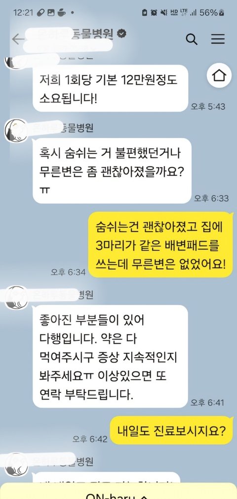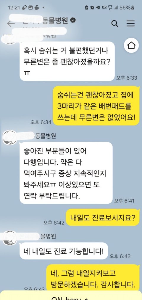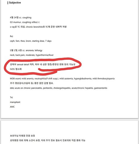 5월6일 아침 아이컨디션이 너무 안좋아 집앞병원으로 다시 가서다양한검사함.지금까지봐주던 수의사분말고 다른분이계셨고지난 엑스레이보더니5월2일부터 정상적이지않은 내장기관상태라고 이야기함.너무놀라서 그런소리 들은적없다하니 차트에써있다함.전 못들엇다 이야기 했는데 실갱이하는시간이 아까워 해주실 수 있는 검사 해달라함.