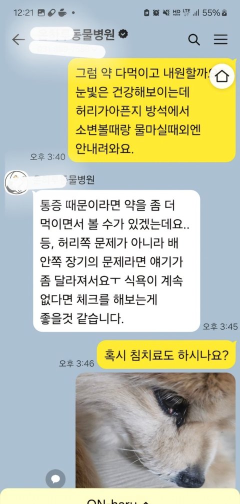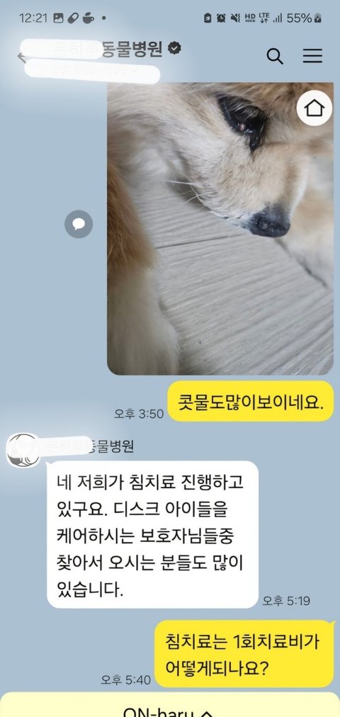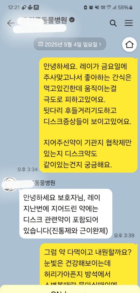 5.4 종일 방석에만있음 산책 안나가려고함뒷다리 힘이잘안들어가는듯디스크 증상 시작인가 겁이났고카카오톡 병원채널에레이의 상태는 더욱 악화됐고, 콧물도 심해졌다고알림. 약의 양도 줄어든 것 같아 “디스크 약(진통제, 근이완제)이 들어 있는 게 맞냐”고 물었음→ 병원은 “들어 있다”고 답했을 뿐, 이날도 복막염이나 염증에 대한 언급은 전혀 없었음.→ 디스크 치료 여부를 묻자 “침 치료하고 있다”는 말함→ 그날이라도 솔직히 말해줬다면, 상황은 달라질 수도 있었을 것입니다.