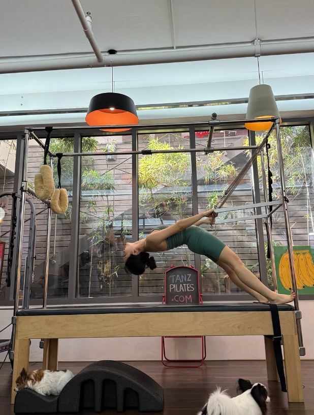 실내에 자연광이 은은하게 들어오는 공간, 운동기구 위에 놓인 복슬복슬한 풋 스트랩, 그리고 조용히 누워 있는 반려견까지…. 이건 완벽한 예리식 ‘힐링 필라테스 타임’이로군요.