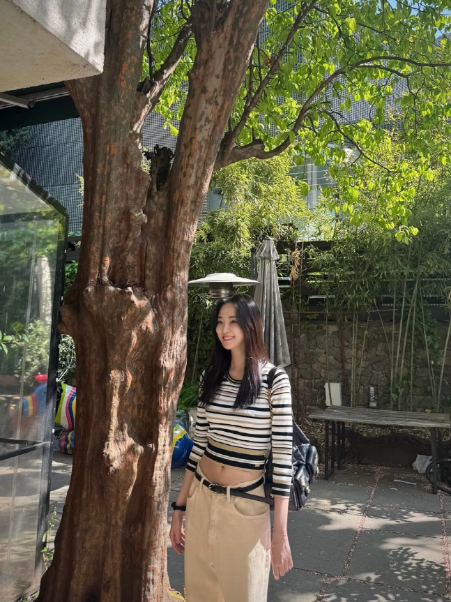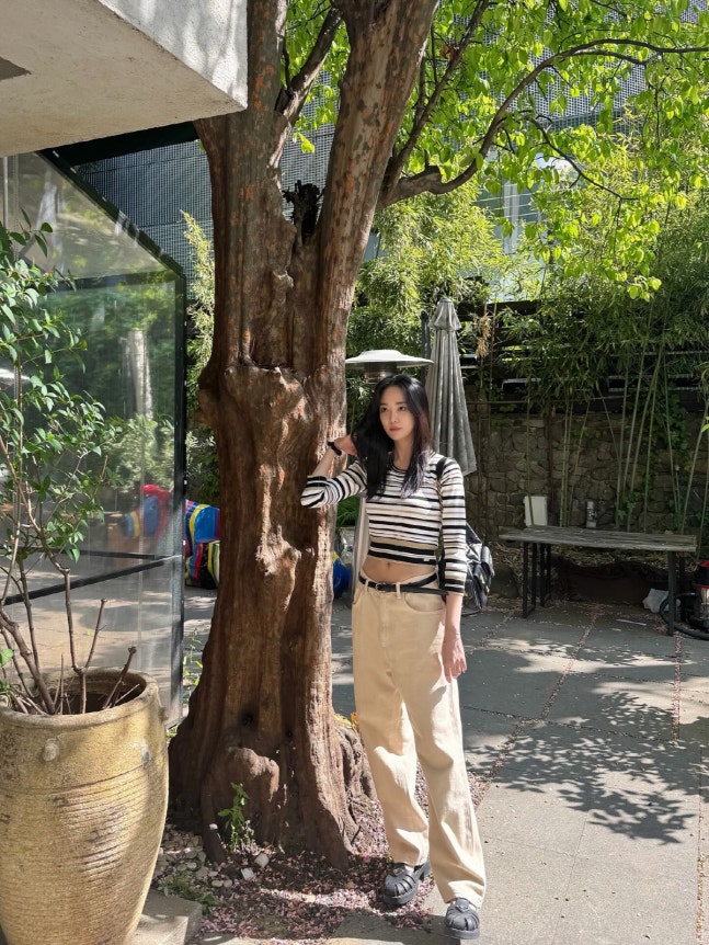 이와 함께 공개된 사진 속 그는 줄무늬 크롭티와 베이지 팬츠를 매치한 캐주얼한 착장을 선보였다. 크롭티로 드러난 허리 라인과 복근이 눈길을 끈다.