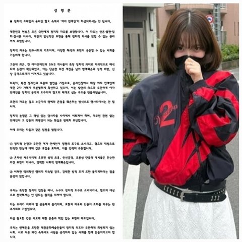 걸그룹 에스파(aespa)의 멤버 카리나가 평범한 일상 사진 한 장으로 정치적 논란에 휘말리는 황당한 해프닝을 겪었다. 사진=카리나 SNS이에 팬들도 공식 성명문을 통해 반박에 나섰다. 성명문에서는 “정치적 프레임과 온라인 혐오 속에서 여자 연예인이 희생되어서는 안 된다”며 “의도 없는 의상 하나로 여성 연예인에게 가해지는 과도한 프레임 씌우기를 중단해야 한다”고 목소리를 높였다.