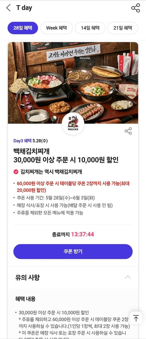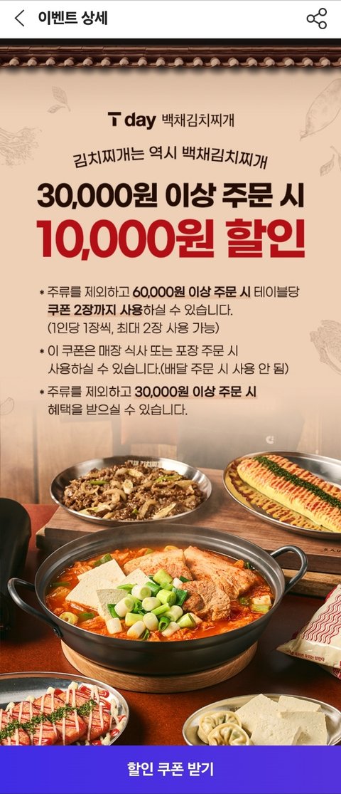 SKT 대상자들 백채김치찌개 최대 2만원 할인 가능!!