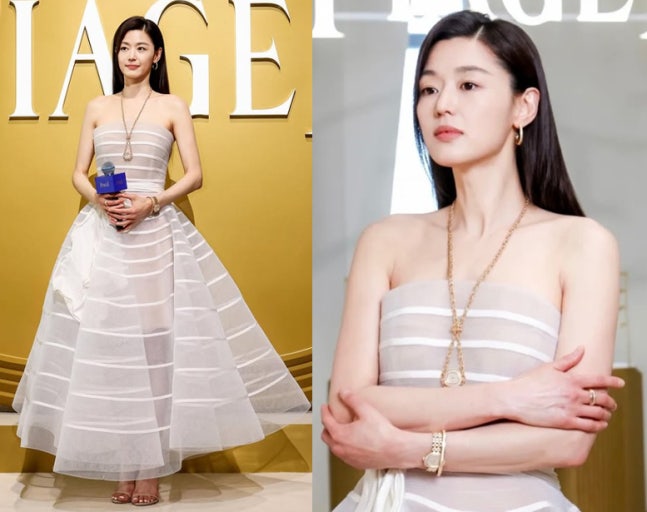 배우 전지현 /사진=피아제지난 24일 전지현은 브랜드 피아제의 글로벌 앰버서더 자격으로 중국 상해에서 열린 식스티 컬렉션 론칭 행사에 참석했다.이날 전지현은 구조적인 스커트가 돋보이는 오스카 드 라 렌타의 화이트 시스루 드레스를 입었다. 그는 튜브톱 드레스에 무려 2억4400만원에 판매되고 있는 시계 목걸이를 매치했다. 매끈한 어깨와 팔 라인이 시선을 사로잡는다.