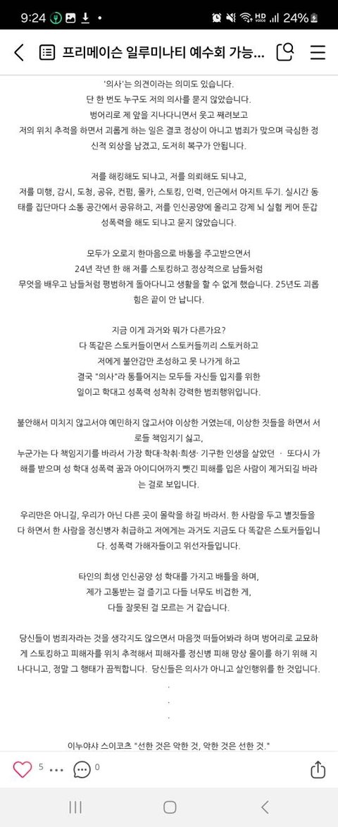 (ex 수개월 고의적으로 정신장애 신체 훼손 자살ㅁ이, 해킹 사이버 불링 미행 감시 입주 스토킹, 위치 추적, 전산시스템 정보 열람 유출, )