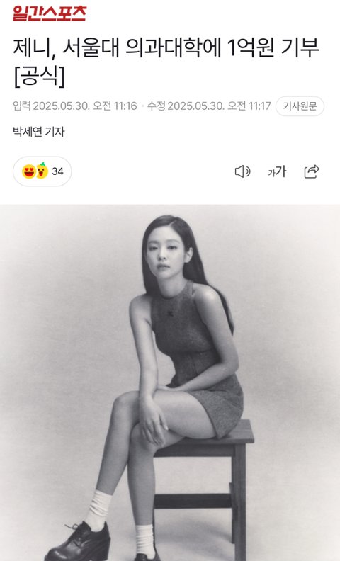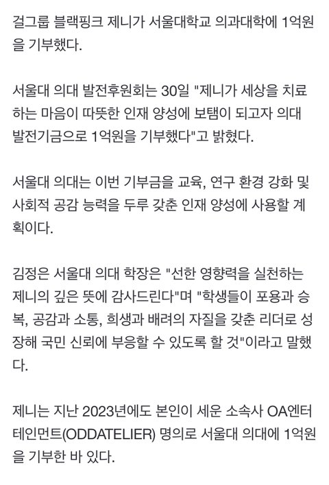 23년에도 아무도 모르게 1억원 기부했었다고함.. 제니 최고