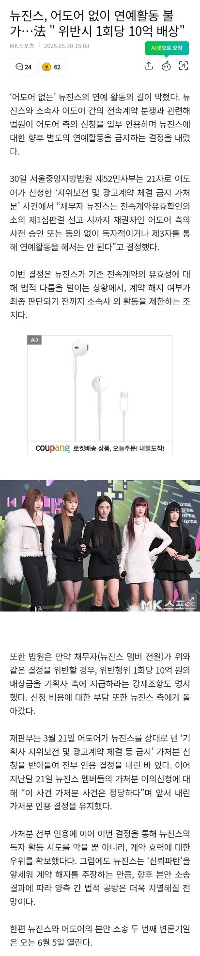뉴진스, 어도어 없이 연예활동 불가…法 " 위반시 1회당 10억 배상"
