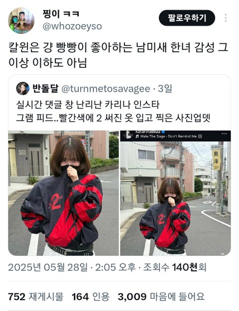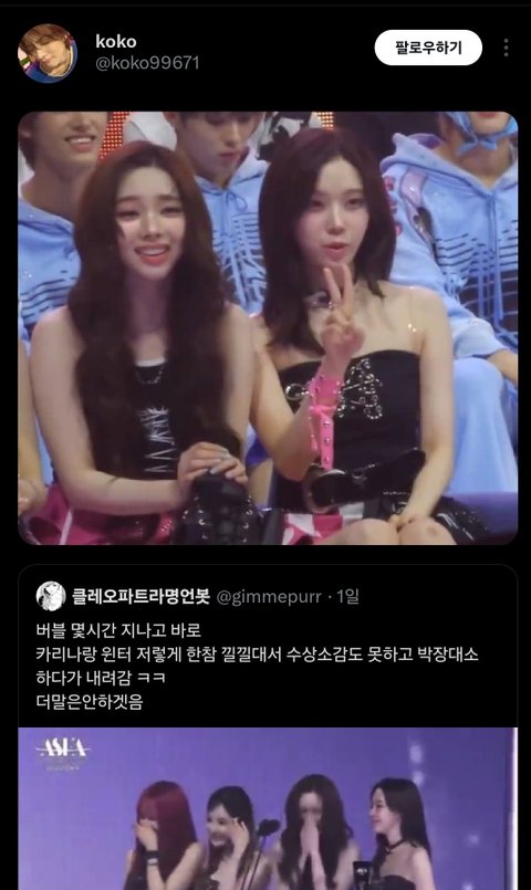 이 밖에 과거논란까지 다 끌올해서 카리나랑 묶어놓고 ㅈㄴ 패는 중 정당한 비판 보다 무지성 억까 비중이 80%임