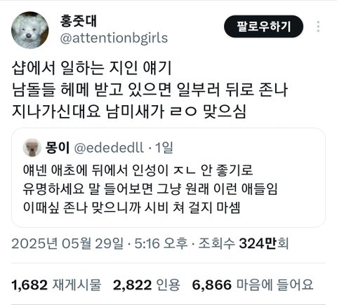 팬한테 팬서비스 해주는 영상 순간 캡처해서 맘찍이랑 알티 몇 천씩 태우는 중 얘도 똑같다면서 몰아감
