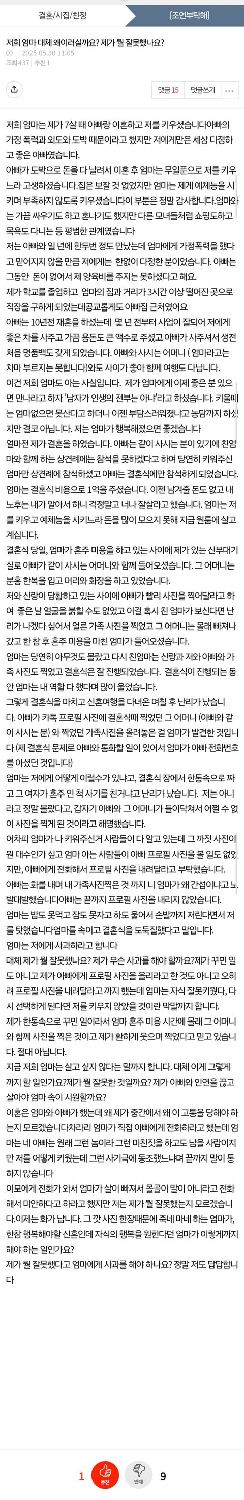 어떻게 어머니라고 부를 수 있지? 어떻게 같이 여행을 다닐 수 있지? 어떻게 그걸 가족사진이라고 칭할 수 있지? 이해가 안 간다. 사돈댁에서 이혼가정이어도 허락해준 이유는 친엄마 보고 결심한 걸텐데, 결혼식장에서 저지레라니.. 나라면 1억도 안 받았다. 혼자인데 집이라도 더 안전한 곳 좋은 곳 살라 하지. 양육비 소송 걸면 그간 안줬던 애비가 사업 잘 됐다고 줄까? 자식이 저렇게 마음 돌아간거 보면 싸게 먹혔네.