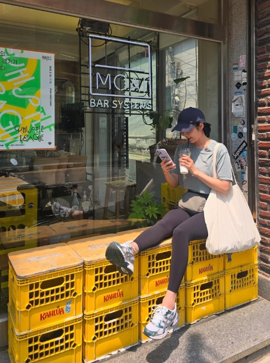 사유리는 보기만 해도 땀이 날 것 같은 도심 한복판에서 기막힌 더위 대처법을 선보였다.T사진=사유리 SNS이른바 “쿨링보단 차단”을 택한 현실 전략, 그 안에서도 어김없이 사유리 특유의 여유와 유머가 살아 있다.또 다른 컷에서는 노란 플라스틱 박스 위에 앉아 음료를 마시며 여유를 즐기는 모습도 눈에 띈다. 볼캡, 크롭탑, 슬링백 조합은 꾸안꾸가 아니라 그냥 ‘일상 그 자체’, 이지룩의 정석처럼 편안하면서도 자연스러운 분위기를 자아낸다.