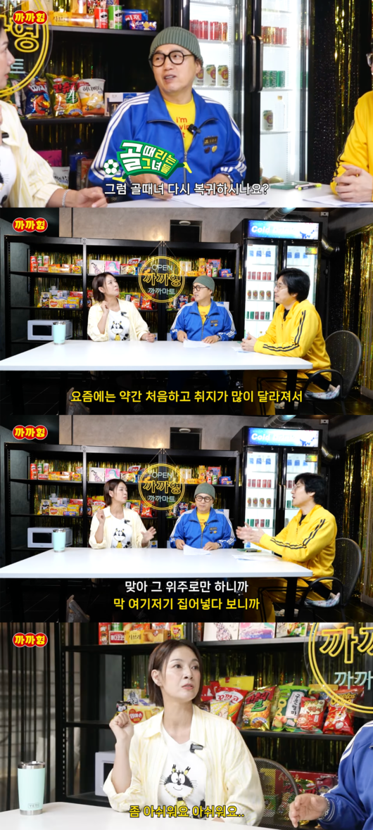 박선영은 축구를 아예 안 하냐는 말에 “‘골때녀’는 안 하지만, 생활 축구는 하고 있다”고 털어놨고, 복귀에 대해서는 “근데 그게 약간..”이라고 머뭇거리다가 “처음하고 취지가 많이 달라졌다”고 털어놨다.