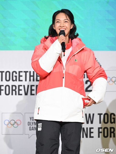 [OSEN=조은정 기자] 6일 오전 서울 송파구 올림픽파크텔에서 '2024 강원 동계청소년올림픽' G-200일을 맞아 '유니폼·메달 공개 및 지속가능 올림픽 선포식 행사’가 열렸다. 탤런트 박선영이 유니폼을 입고 소감을 전하고 있다. 2023.07.06 /cej@osen.co.kr