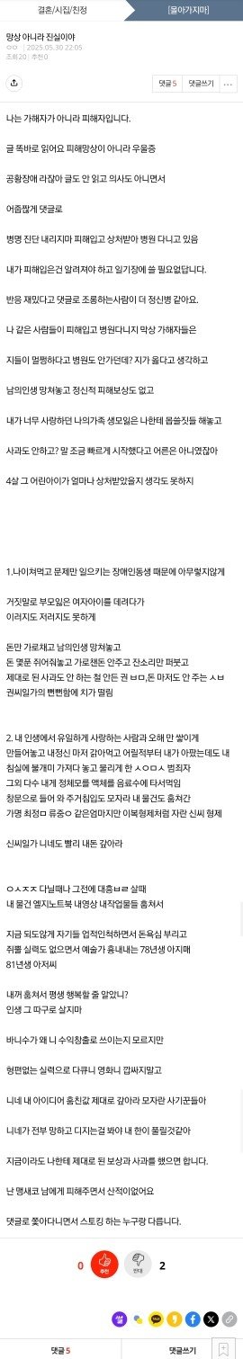 나이 ㅊ먹고 문제 일으키는 장애인은 글의 입장의 사람이 아니라 글 작성자 견찰 딸래미 너란다 헛소리 도배 좀 그만해라 지겹다 느그 아버지 아직도 경찰 안 잘린게 신기하다