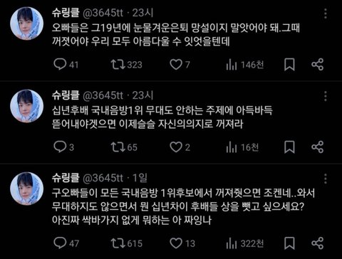 1위 맡겨놓은것도 아니고 징징대는꼴 ㅋㅋㅋ 당최 인성 무엇?