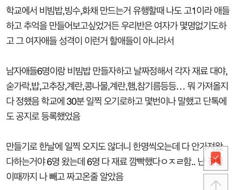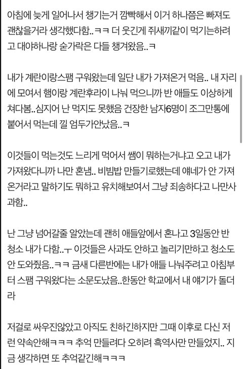 1. 여섯명이서 짜고 늦게 옴╋재료 아무것도 안들고옴 2. 근데 숫가락은 들고옴 3. 들고온 숟가락으로 여자애 자리에서 스팸계란 다 처먹음 4. 선생님한텐 여자애만 가져온거라고 발뺌 5. 혼나고 소문돌고 3일동안 청소할 때 하나도 안도와줌.. 이런데 어떻게 결말이 아직까지 친한거임 ㄹㅇ 호러다 진짜
