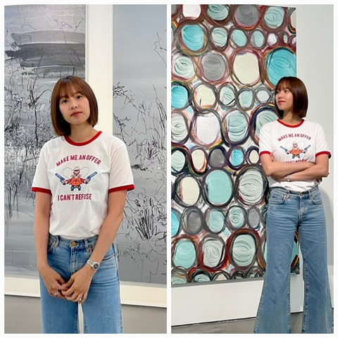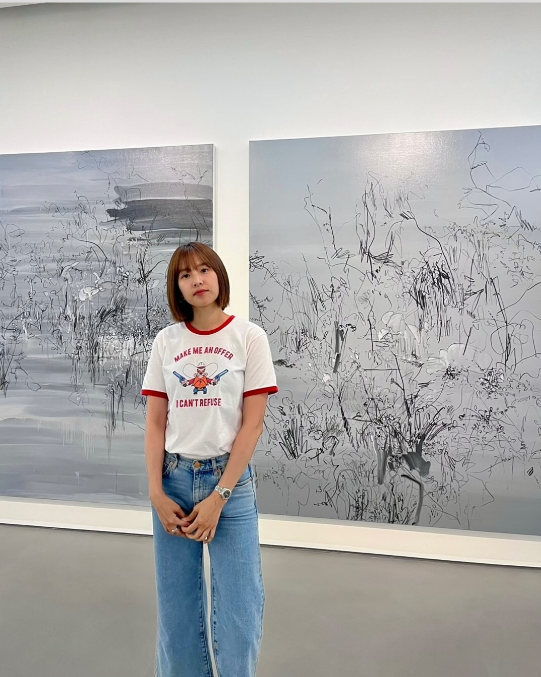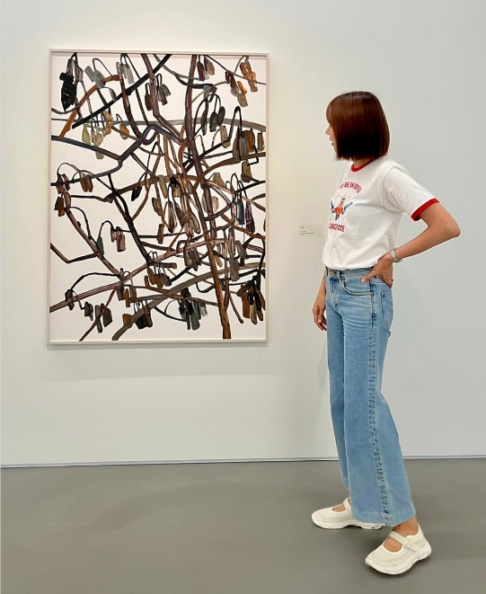 화이트 셔츠에 크림톤 팬츠, 내추럴한 웨이브 헤어로 꾸밈없는 편안함을 보여준 조윤희는 전시회 속 감각적인 설치물 앞에 조용히 서서 사색하는 모습을 담았다.사진=조윤희 SNS