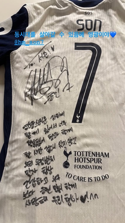손흥민의 7번 유니폼에는 손흥민의 사인과 함께 편지가 담겨 있어 눈길을 끈다.