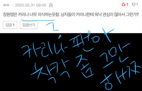 착각은 자유라더니만..ㅉ카리나팬들아 내가볼땐 오히려 니들이 장원영을 의식하는걸로 보이거든?ㅋㅋ원영이가 카리나를 의식한다는둥 질투한다는둥 착각 좀 정도껏해..원영이도 인기많구 광고도 많이 찍고 잘나가는 여돌인데 뭐가 아쉬워서 카리나를 의식해?