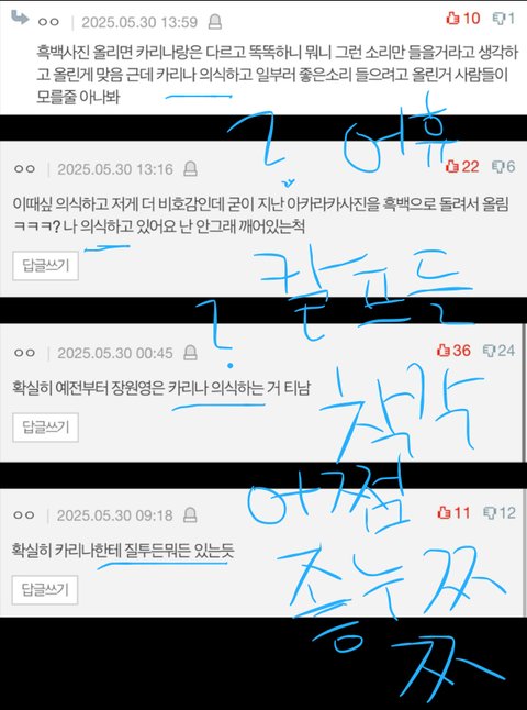 +착각과 망상이 많은 카리나팬들이 잘나가는 장원영이 카리나를 의식한다는둥 견제한다는둥 추한 착각을 하면서 댓글 쓴 사진들임ㅉ