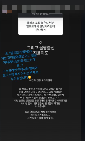 앞서 소희는 '얼짱시대' 출신 지윤미가 한 팬으로부터 받았던 질문을 공개했다. 이에 따르면 이 팬은 "앨리스 소희 결혼도 남편 일프로에서 만난 거라던데 맞나요?"라고 질문했고 이에 소희는 "일프로가 뭐예요?"라며 "저는 같이 촬영했던 언니 생일 파티에서 남편을 만났는데요? 고소하려면 인적사항 알아야 한다는데 혹시 아시는 분 제보 부탁드립니다"라고 답했다.