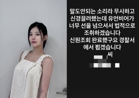 소희는 31일 "말도 안되는 소리라 무시하고 신경 끌려고 했는데 유언비어가 너무 선을 넘으셔서 법적으로 조치하겠습니다. 신원조회 완료했고요 경찰서에서 뵙겠습니다"라고 밝히고 당사자의 이름과 아이디를 공개했다.