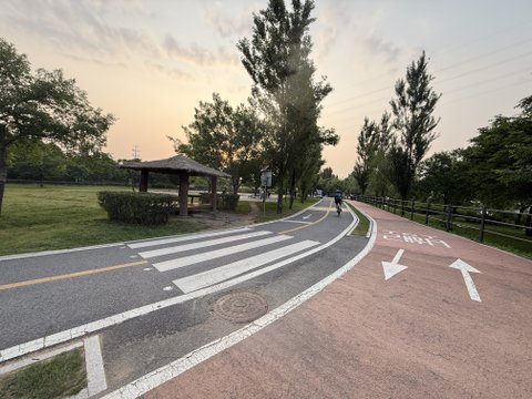 양화 한강공원 부근, 성수 하늘다리(선유도 가는길) 육교에서 계단으로 내려오면 자전거길에 횡단보도 2개가 있는데, 정자가 보이는 커브길 횡단보도에서 로드 자전거와 크게 충돌을 했습니다.(아래 이미지 있음)