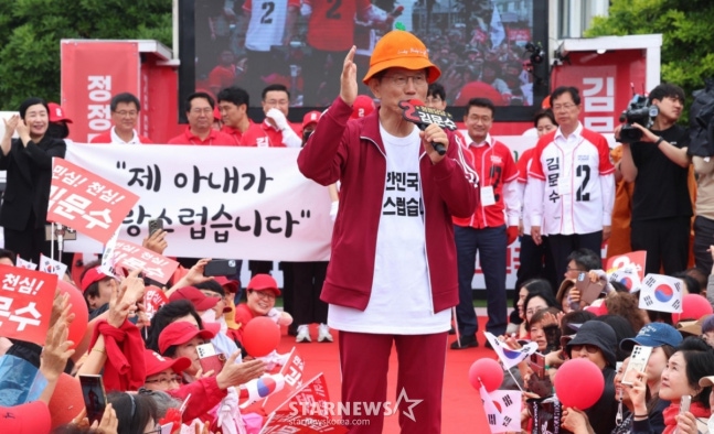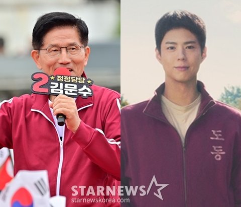 이날 김 후보는 제주도를 배경으로 한 넷플릭스 드라마 '폭싹 속았수다' 속 남자 주인공 양관식(박보검 분)이 자주 입었던 빨간색 트레이닝복을 입고 등장했다.