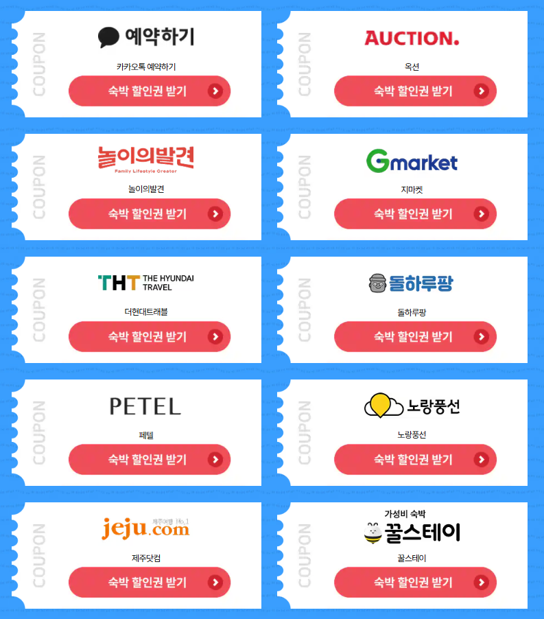 강원도: 동해안, 설악산, 평창 등충청도: 대천해수욕장, 온양온천 등경상도: 부산, 경주, 안동 등전라도: 여수, 순천, 전주 등제주도: 말이 필요 없죠!특별재난지역편 (더 큰 할인!)경남: 산청군, 하동군