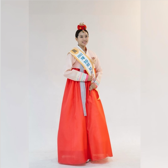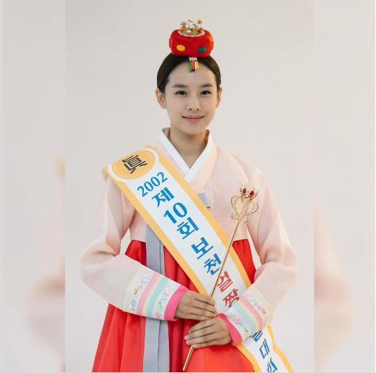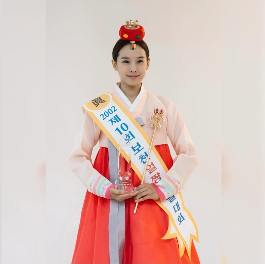 붉은 치마와 옅은 분홍 저고리, 머리 위에는 전통 족두리를 단단히 얹은 모습. 가슴엔 ‘2002 제10회 보천 선발대회 진’이라 쓰인 리본이 걸려 있어, 마치 23년 전 미인대회를 연상케 하는 단정한 자태가 눈길을 끌었다.