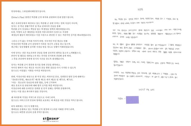 ▲ 이하 스타쉽엔터테인먼트 공식 SNS 전문과 유포자 A씨 반성문.