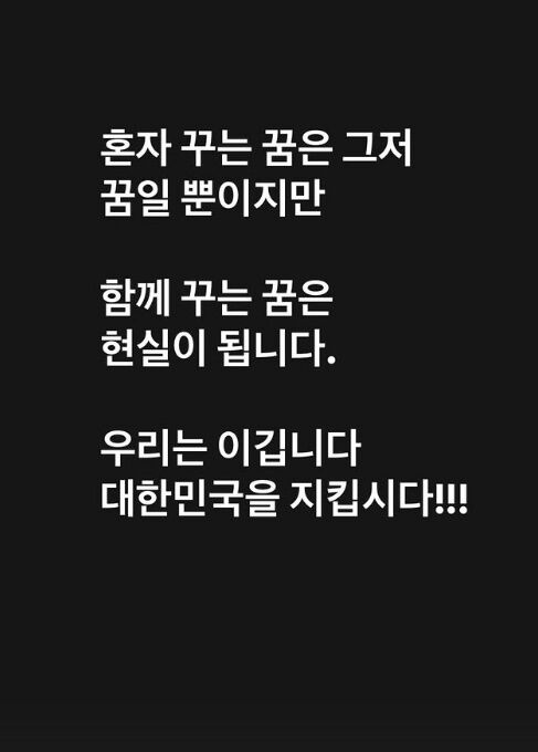 그는 이날 개인 계정 스토리에 “혼자 꾸는 꿈은 그저 꿈일 뿐이지만 함께 꾸는 꿈은 현실이 됩니다. 우리는 이깁니다 대한민국을 지킵시다”라는 글을 게재했다.