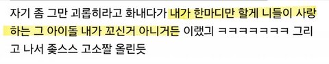 + 영상 봄 '너가 좋아하는 아이돌이 나를 사랑한다고해서 내가 욕먹을 자리는 아니거든? 내가 먼저 꼬신것도 아니고' 정확히 이렇게 말함 그리고 남친 팬들이 가족들도 괴롭히나봄 울면서 얘기하네ㅠㅠ 남친은 뭐하누 다 알고있을텐데...저렇게 힘든 사랑할바엔 둘 다 그냥 헤어지면 안 되나