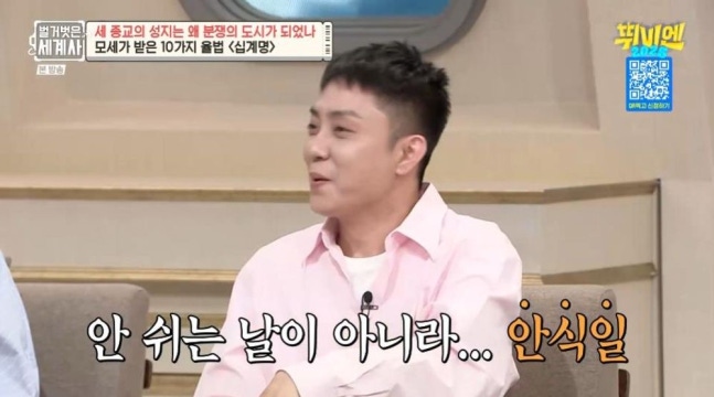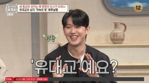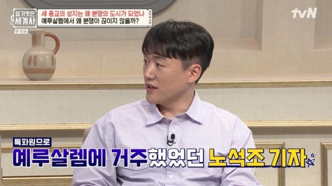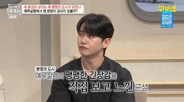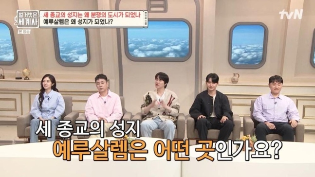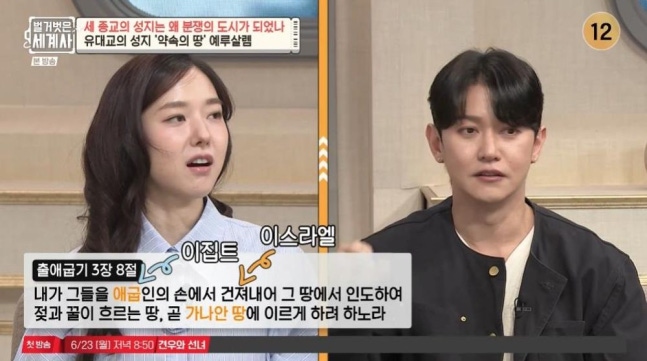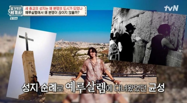 은지원은 "사람이 살기 힘든 땅이 왜 성지가 됐냐"라고 물었고, 성 교수는 "신앙과 관련이 있다. 예루살렘을 가장 먼저 성지로 여긴 종교는 유대교다. 유대교에 따르면 예루살렘은 하느님이 주신 약속의 땅이었다"라고 전했다.